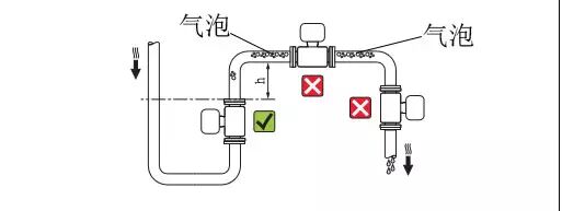 1. 如上图所示,不易安装在管道的 点,更换安装位置 2. 如安装位置不易更换,可在流量计上游安装集气器,定期排气